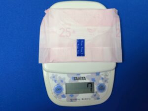 課題を頂いたので、ナプキンを取り出して計量計で重さを量りました。ナプキンだけの重さは7gです。ナプキンだけを股間にはり 課題を頂いたので、ナプキンを取り出して計量計で重さを量りました。ナプキンだけの重さは7gでした。