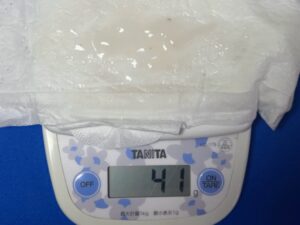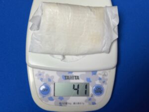 粘液を吸ったナプキンの重さは41gでした。ナプキンを開いたまま乗せているのだと重さが変わるかもと思い、ナプキンを丸めて測ってみても重さは変わりませんでした。