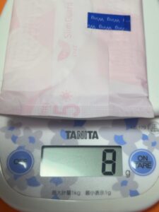オシッ〇を終えて部屋に帰って来て新しいナプキンを取り出してまた重さを量ります。
