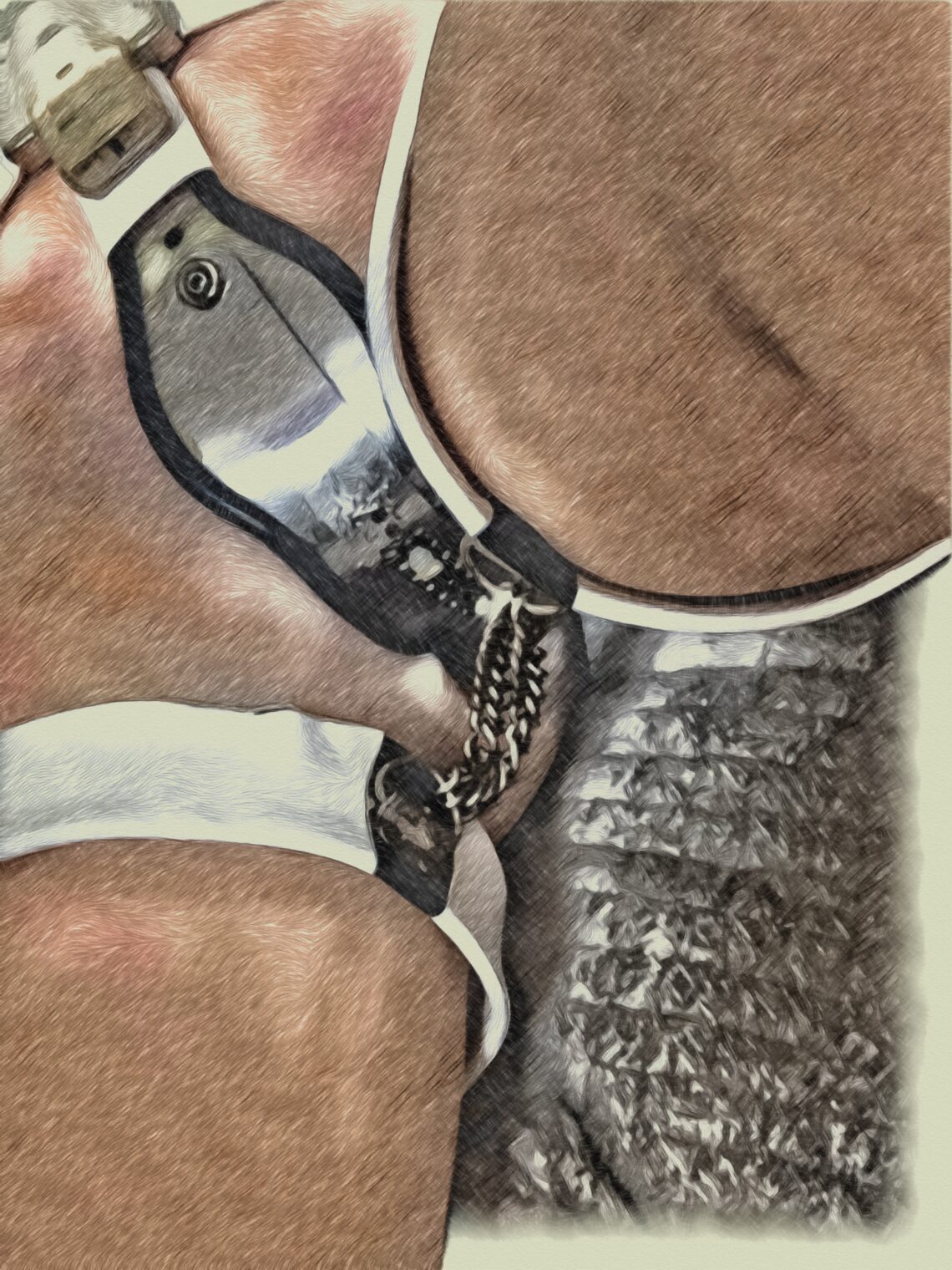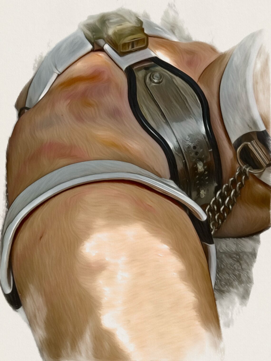 首と両手首にステンレス製のストレートバーネックカラー&ハンドカフを嵌められ、 二の腕にステンレス製のアッパーアームカフを嵌められ左右のアッパーアームカフが背中で短い鎖で繋がれ固定され脇を締めた状態で殆ど動かせない状態に…